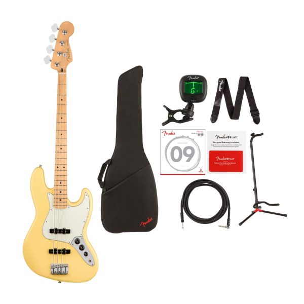 Bundle Includes: Fender Player Jazz 4-String Bass Guitar (Right-Handed, Buttercream) 4 x Fender 7250 Bass Strings (Nickel Plated Steel, Long Scale, 7250M .045-.105 Gauges) Fender FB405 Electric Bass Gig Bag (Black) Fender Professional Series Instrument Cable (Straight-Angle, 10-ft, Black) Fender Adjustable Guitar Stand for Electric, Bass and Acoustic Guitars Fender FT-1 Pro Clip-On Tuner Fender Logo 2-inch Black Polyester Strap with White Fender Logo Fender Play 3-Month Prepaid Card